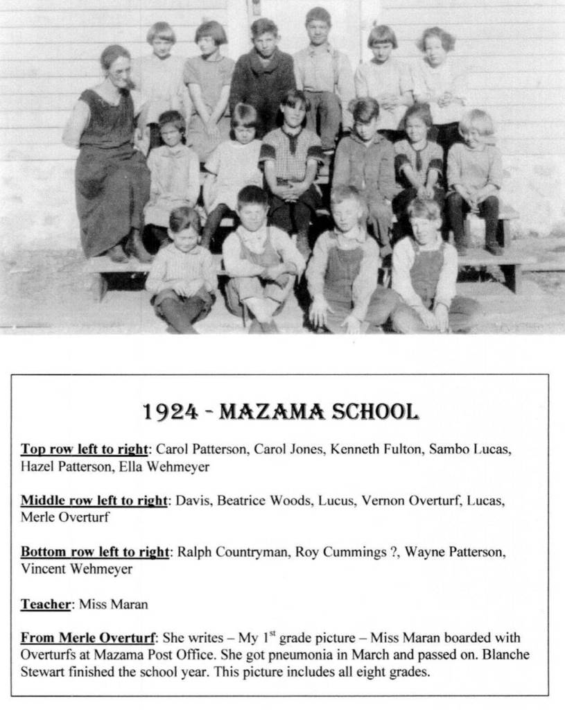 Mazama School was built in 1921. Blanche Stewart was the teacher. Interestingly, her contract stated that if she were to marry her teaching contract would be “null and void” The school used 8 cords of wood per winter.