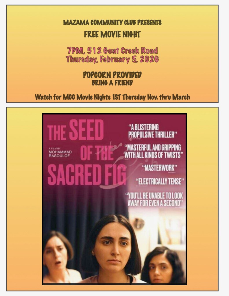 It’s Movie Night at the Mazama Community Club on Thursday, Dec. 11th. This month’s selection is “Spirited” with Will Ferrell and Ryan Reynolds. This is a modern retelling of the classic Charles Dickens story A Christmas Carol with an uplifting ending. Both movie and popcorn are free. So, bring a friend and a beverage to enjoy this comedy.
